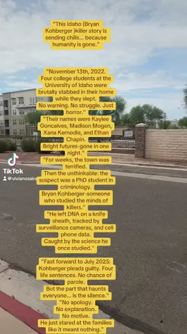 "This Idaho killer story is sending chills... because humanity is gone." Four college students at the University of Idaho were brutally stabbed in their home while they slept. No warning. No struggle. Just horror." "Their names were Kaylee Goncalves, Madison Mogen, Xana Kernodle, and Ethan Chapin. Bright futures-gone in one night." "For weeks, the town was terrified. Then the unthinkable: the suspect was a PhD student in criminology. Bryan Kohberger-someone who studied the minds of killers." "He left DNA on a knife sheath, tracked by surveillance cameras, and cell phone data. Caught by the science he once studied." #fyp #BryanKohberger #idahokillers