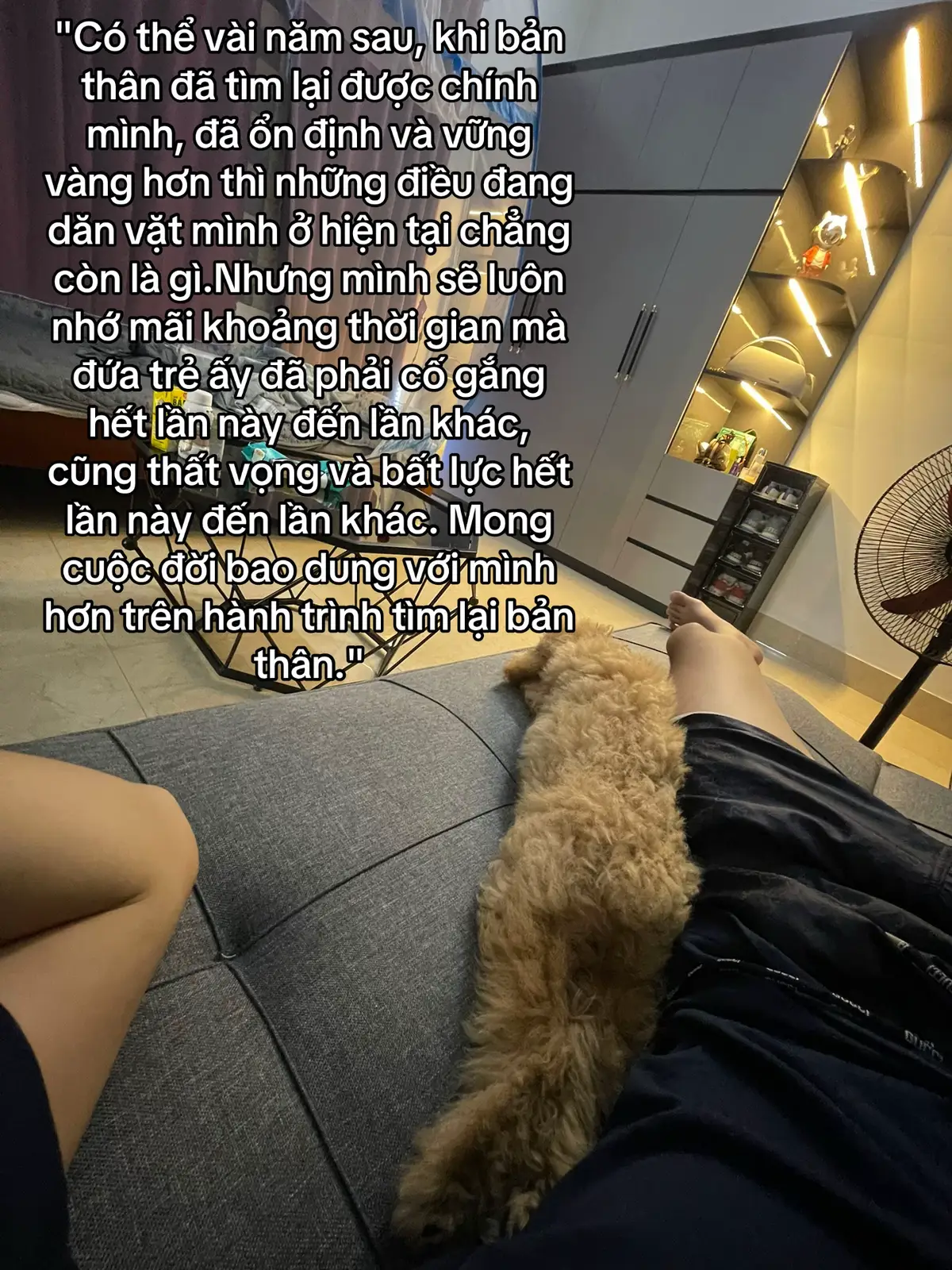 "Có thể vài năm sau, khi bản thân đã tìm lại được chính mình, đã ổn định và vững vàng hơn thì những điều đang dăn vặt mình ở hiện tại chẳng còn là gì.Nhưng mình sẽ luôn nhớ mãi khoảng thời gian mà đứa trẻ ấy đã phải cố gắng hết lần này đến lần khác, cũng thất vọng và bất lực hết lần này đến lần khác. Mong cuộc đời bao dung với mình hơn trên hành trình tìm lại bản thân."