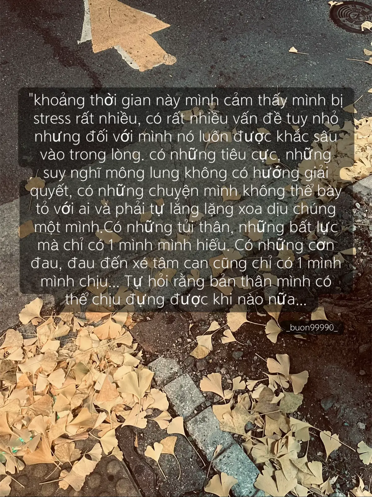 "khoảng thời gian này mình cảm thấy mình bị stress rất nhiều, có rất nhiều vấn đề tuy nhỏ nhưng đối với mình nó luôn được khắc sâu vào trong lòng. có những tiêu cực, những suy nghĩ mông lung không có hướng giải quyết, có những chuyện mình không thể bày tỏ với ai và phải tự lẳng lặng xoa dịu chúng một mình.Có những tủi thân, những bất lực mà chỉ có 1 mình mình hiểu. Có những cơn đau, đau đến xé tâm can cũng chỉ có 1 mình mình chịu... Tự hỏi rằng bản thân mình có thể chịu đựng được khi nào nữa... #buon99990 #motminh #codon #tuithan #buon_tam_trang