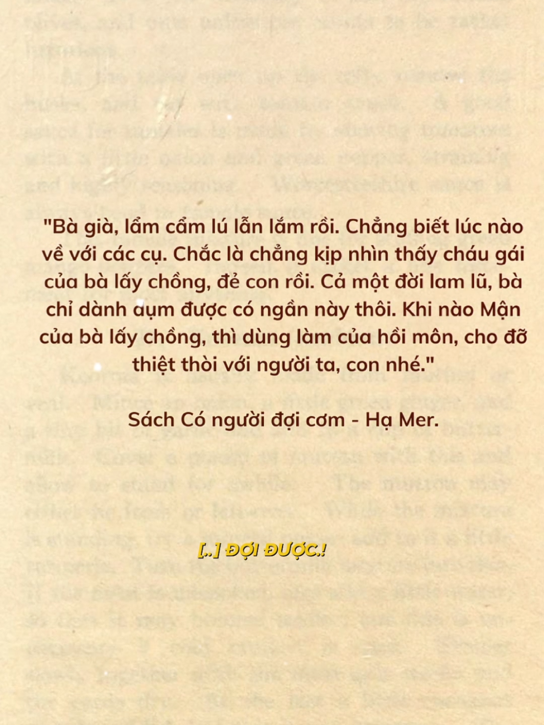 "Bà già, lẩm cẩm lú lẫn lắm rồi. Chẳng biết lúc nào về với các cụ. Chắc là chẳng kịp nhìn thấy cháu gái của bà lấy chồng, đẻ con rồi. Cả một đời lam lũ, bà chỉ dành dụm được có ngần này thôi. Khi nào Mận của bà lấy chồng, thì dùng làm của hồi môn, cho đỡ thiệt thòi với người ta, con nhé." Có người đợi cơm - Hạ Mer. #conguoidoicom #hamer269 #BookTok #truyenngan #giadinh
