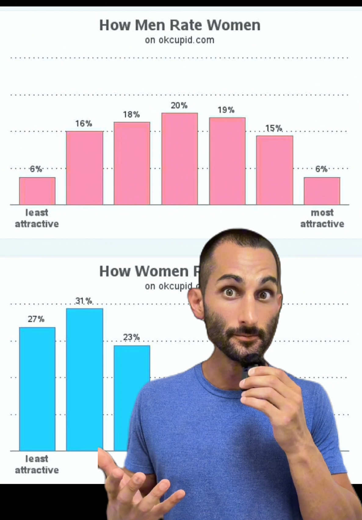 This chart comes from real data collected on a major dating site where users rated profile photos from least attractive to most attractive. It shows how differently men and women see each other. Men rated women almost evenly, but women’s ratings of men looked nothing like that.