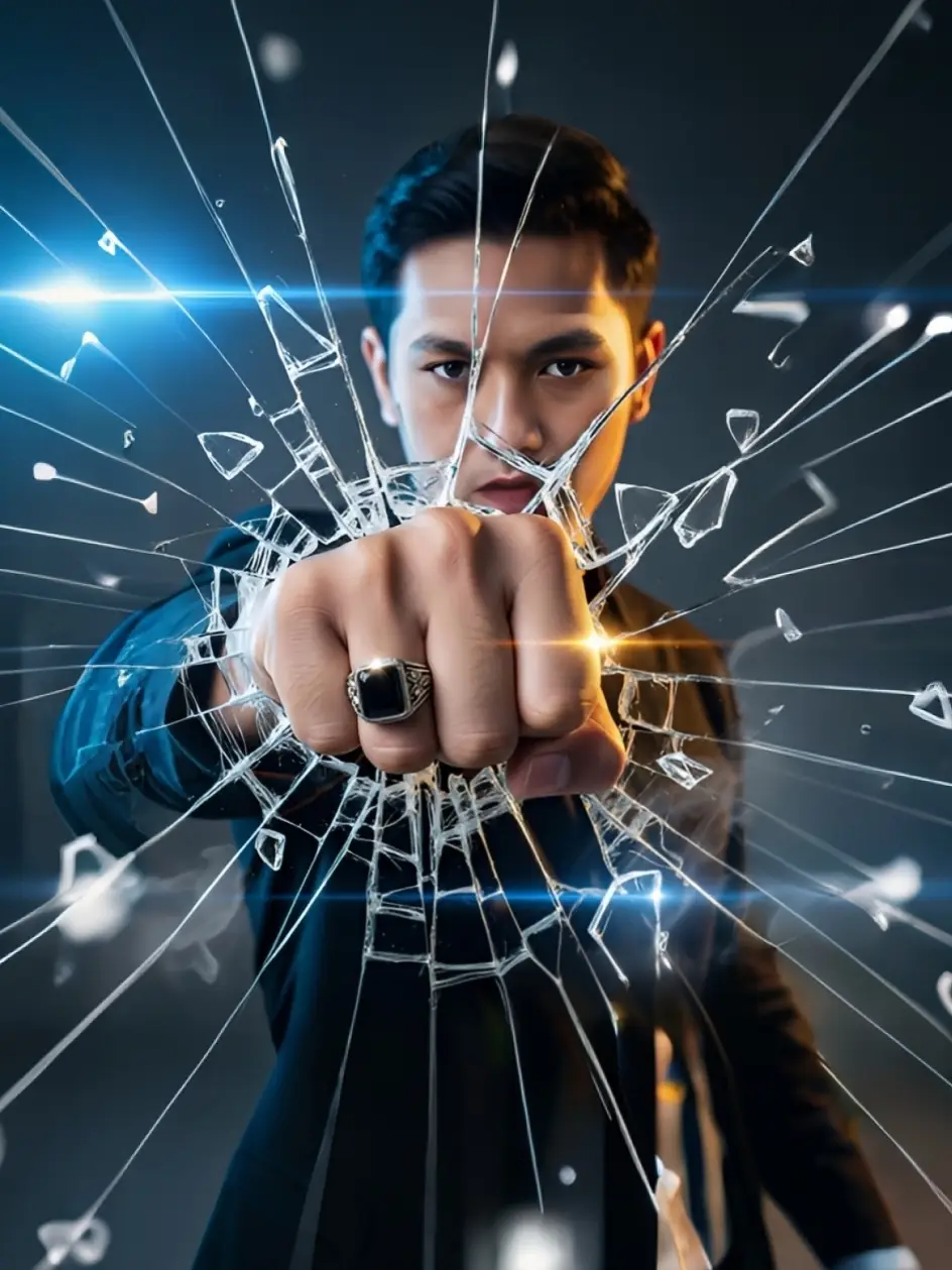 "Ultra-cinematic 3:4 Hollywood action movie poster style. A powerful scene of a 27-year-old Indonesian man smashing his fist through shattered glass, with the hand forcefully breaking forward so it looks like it’s bursting out of the glass toward the viewer, just like a dynamic 3D punch. On his right ring finger, a bold silver onyx ring with a glossy black stone is visible, catching light in the middle of the action. The glass fragments scatter outward dramatically, sharp and glowing from reflected light, creating a sense of explosive energy. His face is partially visible behind the fist through the broken glass, with an intense and determined expression. Features: oval-tirus face with sharp jawline, slim cheeks, short slightly rounded chin, sawo matang terang skin with warm undertone, almond-shaped eyes slightly narrowed, straight thick eyebrows, proportional nose, medium lips, neatly combed short black hair. Lighting: Hollywood dramatic style — strong high-contrast key light with cool bluish tones on the glass shards and a warm golden rim light accentuating his face and hand. Subtle smoke, cinematic lens flares, and depth-of-field blur create a big-budget blockbuster feel. The overall mood is intense, heroic, and photorealistic, like a poster for a Hollywood action movie." #geminiai #prompt #AsepJongUn #AIGeneratedArt #AITok