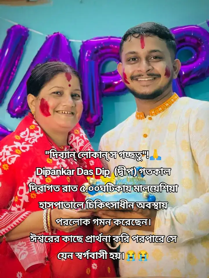 "দিব্যান্ লোকান্ স গচ্ছতু"!🙏 Dipankar Das Dip (দ্বীপ) গতকাল দিবাগত রাত ৫.০০ঘটিকায় মালয়েশিয়া হাসপাতালে চিকিৎসাধীন অবস্থায় পরলোক গমন করেছেন। ঈশ্বরের কাছে প্রার্থনা করি পরপারে সে যেন স্বর্গবাসী হয়।#foryou #fyp #foryoupage #unfrezzmyaccount
