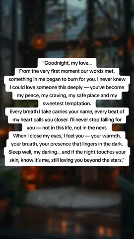 "Buonanotte, amore mio… Dal primo istante in cui le nostre parole si sono incontrate, qualcosa dentro di me ha iniziato a bruciare per te. Non sapevo di poter amare qualcuno così profondamente — sei diventato la mia pace, il mio desiderio, il mio rifugio e la mia più dolce tentazione. Ogni respiro che prendo porta il tuo nome, ogni battito del mio cuore ti chiama a sé. Non smetterò mai di innamorarmi di te — non in questa vita, né nella prossima. Quando chiudo gli occhi, ti sento — il tuo calore, il tuo respiro, la tua presenza che rimane sospesa nel buio. Dormi bene, amore mio… e se la notte sfiora la tua pelle, sappi che sono io, che continuo ad amarti oltre le stelle." #loveletter #loveyou #fyp #fyyyyyyyyyyyyyyyy #lovequotes