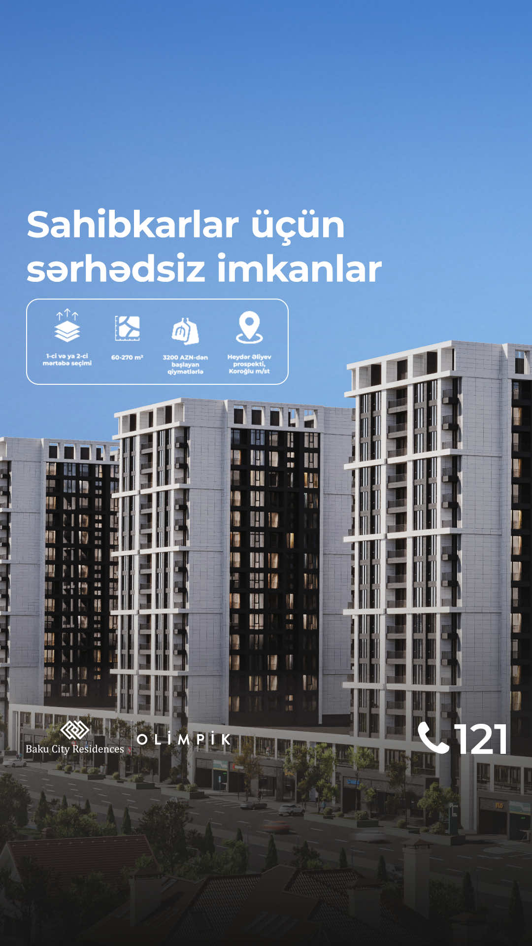 "Baku City Residences Olimpik" bizneslər üçün sərhədsiz imkanlar təqdim edir! 🏙️ İstər mövcud biznesinizi genişləndirin, istərsə də yeni ideyanızı həyata keçirin. Kompleksimizin 1-ci və 2-ci mərtəbələri sizin üçün hazırdır! ✨ 60–270 m² sahələr; 💸 3200₼-dan başlayan qiymətlərlə; 🟢 Cəmi 30% ilkin ödənişlə, 24 ayadək faizsiz hissəli satış; 🔖 Tam ödəniş zamanı əlavə endirim fürsəti. 📍 Heydər Əliyev pr. 189 📞 121