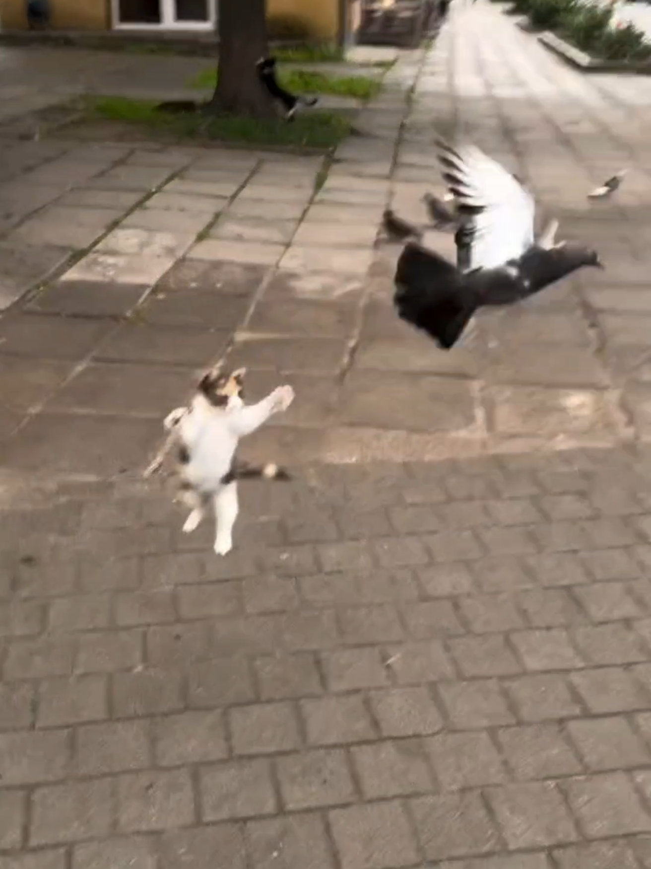 "This tiny kitten thinks it’s a fearless hunter! 😹🦢 Jumping at pigeons way bigger than itself, full of courage and zero luck! 💪🐾 Cutest little warrior on the streets! ❤️" #TinyKitten #FearlessKitten #CuteCat #StreetCat #PigeonVsKitten