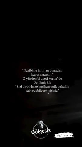 "Nasibinle imtihan olmadan kavuşamazsın." O yüzden bi ayeti kerim' de Denilmiş ki; "Sizi birbirinize imtihan ettik bakalım sabredebilecekmisiniz" - Gölgesiz #gölgesiz , #şiir , #hasret , #özlem , #duygusalşiir