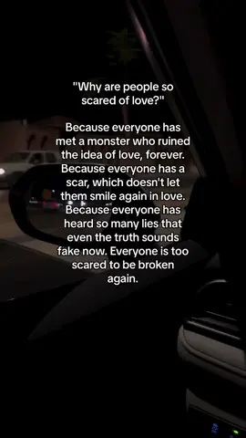 "Why are people so scared of love?" Because everyone has met a monster who ruined the idea of love, forever. Because everyone has a scar, which doesn't let them smile again in love. Because everyone has heard so many lies that even the truth sounds fake now. Everyone is too scared to be broken again.#foryou #viral #foryourpage #brokenangel_05 #emotion #betrayal #breakup #movingon #cheater #fyp