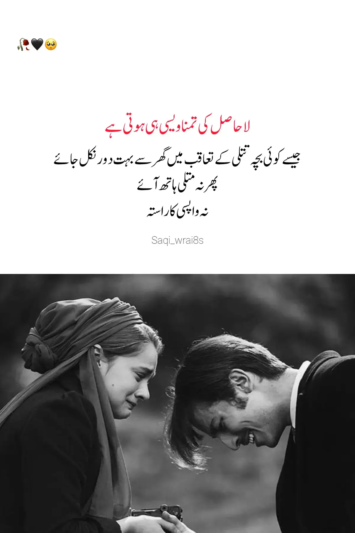 "لا حاصل خواہشوں کے پیچھے بھاگنا بھی عجب سفر ہے… بلکل اُس بچے کی طرح جو تتلی کے رنگوں میں کھو کر گھر سے بہت دُور نکل جاتا ہے۔ آخر میں نہ تتلی ہاتھ آتی ہے، نہ راستے اپنی پہچان رکھتے ہیں۔ صرف تھکن رہ جاتی ہے، اور دل میں ایک ایسی خاموش پیاس… جو نہ پوری ہوتی ہے، نہ ختم۔"